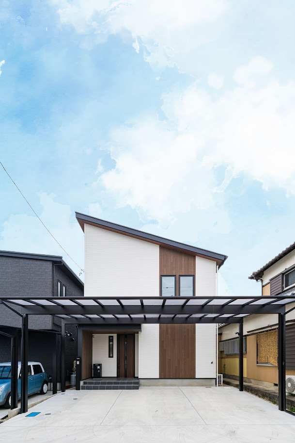 外観は片流れ屋根とし、白と木目調のコントラストが映えるシンプルなデザインに仕上げました。